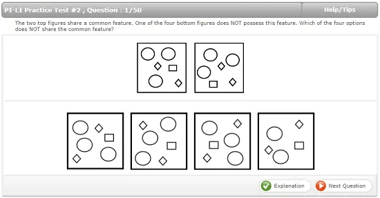 Inom varje figur i den här gruppen finns det tre cirklar, två romber och en kvadrat. De fyra formerna har ordnats slumpmässigt. Regeln gäller alla figurer utom alternativ (4) som har enbart två cirklar.